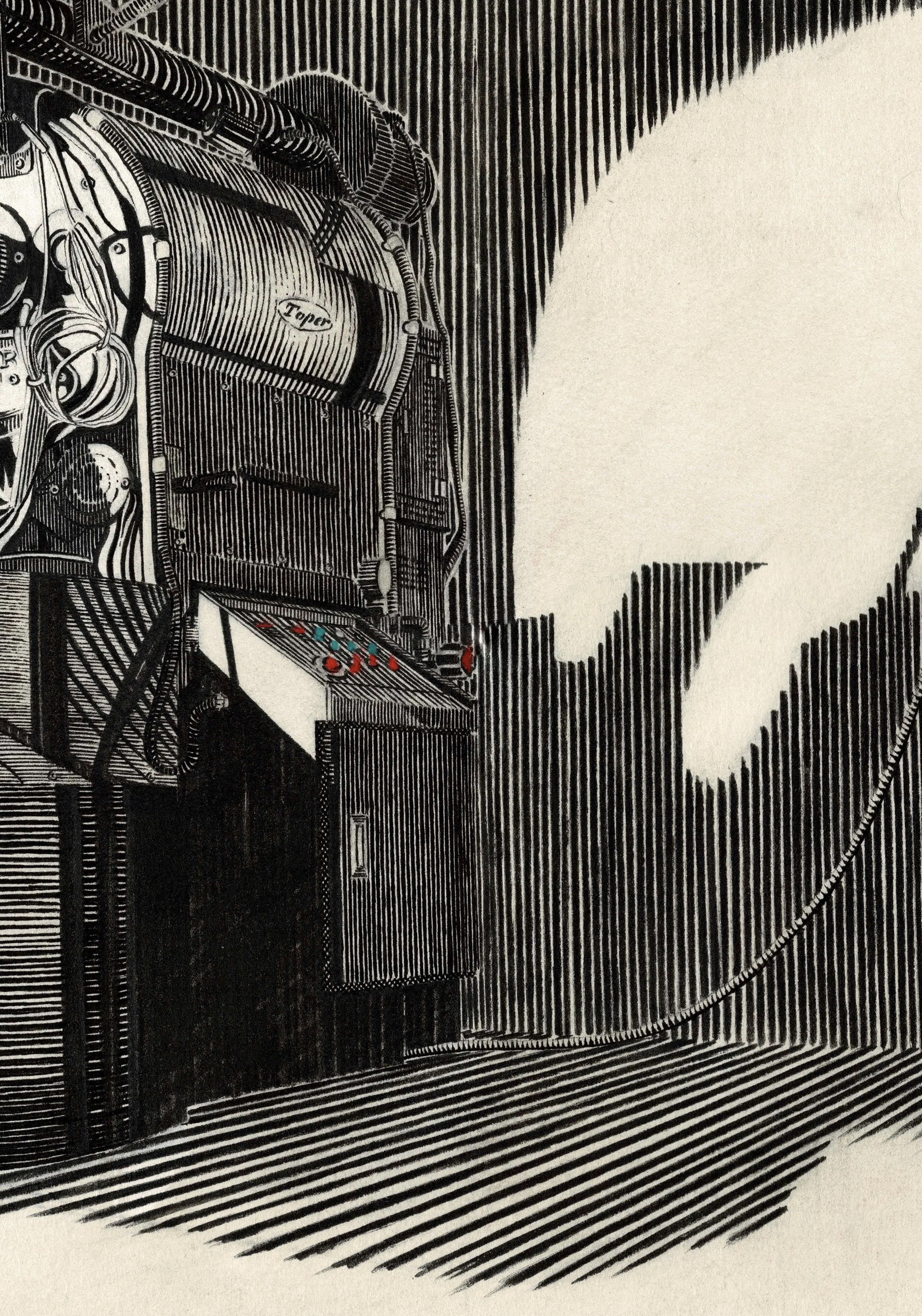 Completed on 600gsm hot pressed smooth paper, in black archival ink, with touches of pastel for colour.